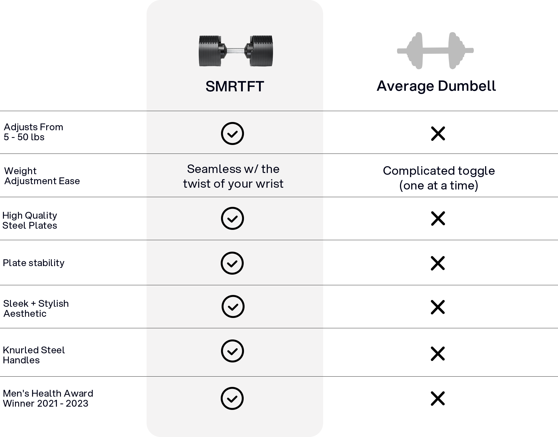 At SMRTFT, we only sell the most innovative, highest-quality fitness products on the market. SMRTFT NUOBELLs feel like traditional dumbbells. They have comparable knurling (the horizontal and vertical crossing lines on the handle). We aim for a mid-range knurling feel. The size of the dumbbells, at any weight from 5 to 80 lbs, is similar to those you find at your local gym. Also, we arrange the plates so that you don't have a bar sticking out the end, no matter the weight. Many other adjustable dumbbells are designed differently and feel "weird" for seasoned weight lifters.
