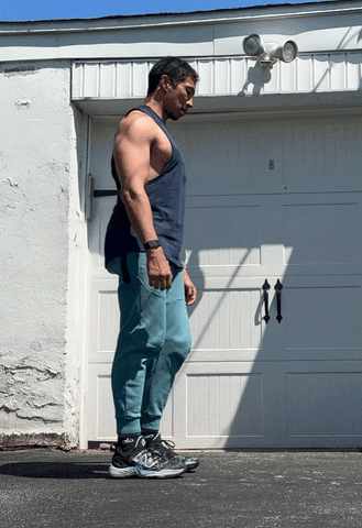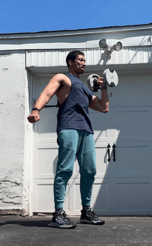 Grab a light dumbbell (read: about half what you might overhead press, if not less), then hold it at your shoulder. Bend our knees and push your butt back slightly, then explosively stand, driving onto your toes and propelling the dumbbell upward. Lower with control. This slow lower reinforces shoulder control, while the explosive drive upwards begins priming your body to be quick and powerful. Do reps for 60 seconds on each side.