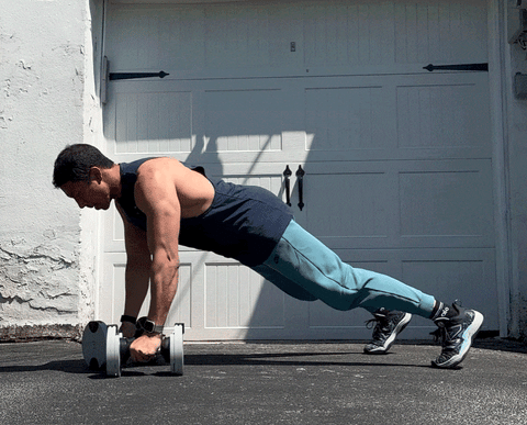 Finish by getting just a little twist into your life by doing plank rows. This zones in on your abs and also primes your mid-back muscles for action. Do alternating reps for 60 seconds, then you’re ready for any strength workout.